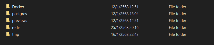 3. เข้าไปในโฟเดอร์ kitsu จากนั้นสร้างโฟเดอร์ Docker (โดยที่ตัว D เป็นตัวใหญ่), postgres, previews, redis and tmp